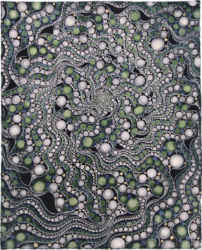 Stenciled linen pulp and acrylic on cotton and abaca base sheet.
