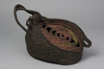 woven fibers, earth pigments, cowrie shells, and boar's tasks