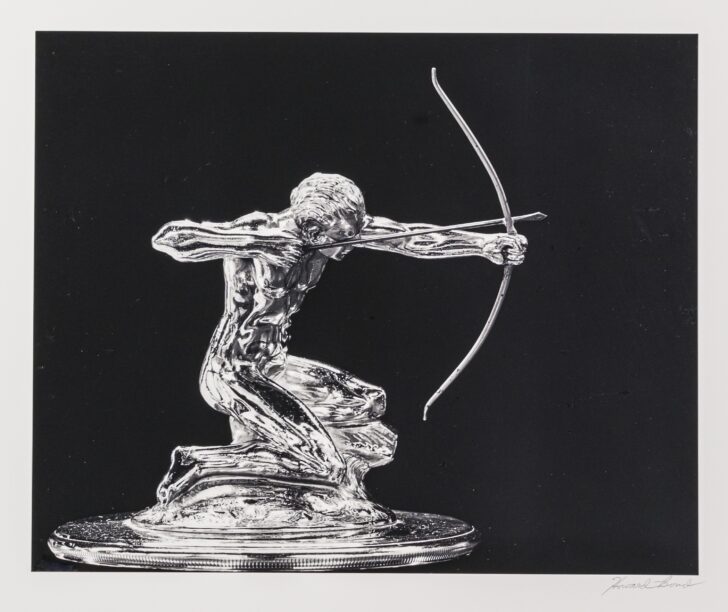 The figure of a nude archer rendered in luminous metal stands against a black background. He sets a long arrow against a stringless bow, resting his left leg on a low shape projecting from the circular base of the statue.