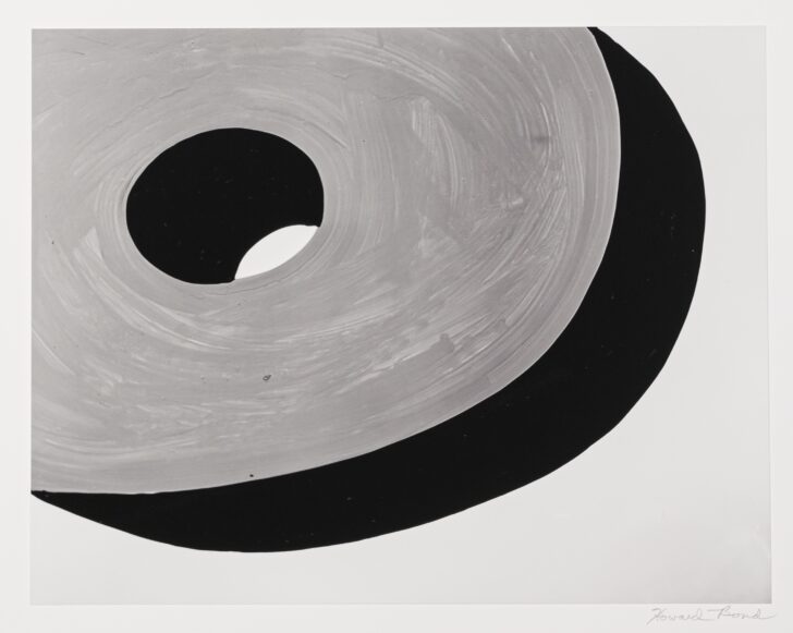 Close view of a circle hand-painted onto a lighter background. A thick, black edge has been added to lend the appearance of three-dimensional object. Another thick black curve rests at the center, changing the circle to an "O".