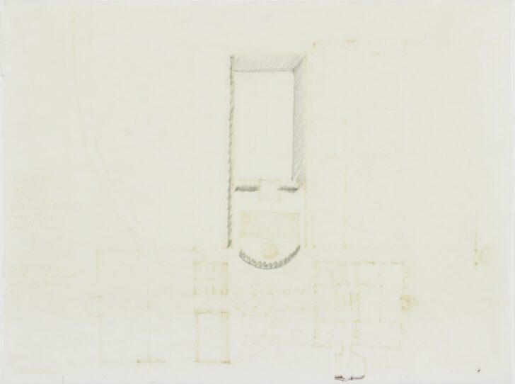 A layout of a building, rendered in faint yellow lines. In the center is a rectangular shape, its bottom curved downward, etched in darker lines. Along the right-center is faint text.