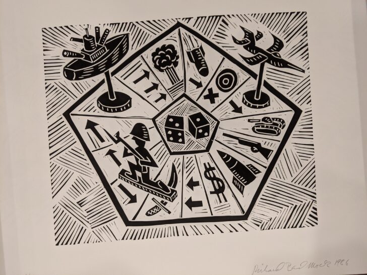 A print in black of a five-sided shape that gives the impression of a gameboard, with an outer area split up into fifteen sections around a center area containing two die showing the numbers two and one. The outer sections contain directional arrows and icons including a cloud, a rocket, a bulls-eye target, a tank, a rifle, and dollar sign, and a sword. Three pieces sit in different sections, one in the shape of a plane, one in the shape of a ship, and one in the shape of a soldier with a bayonet.