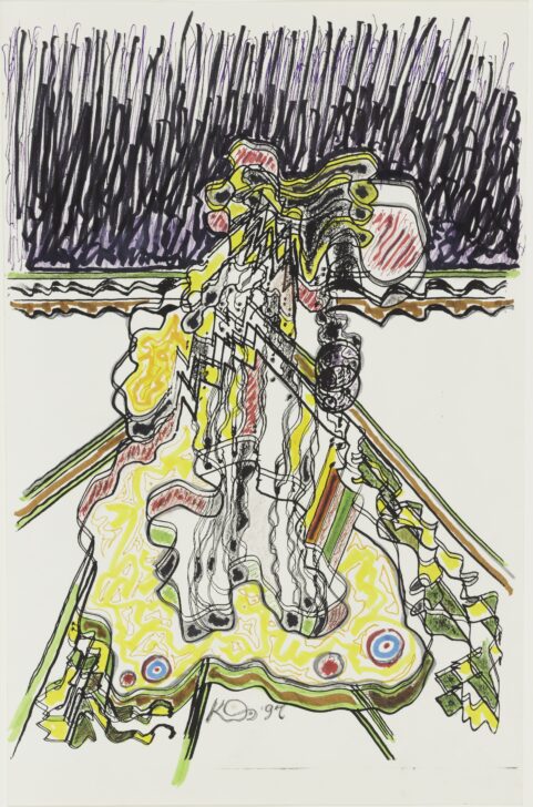 An abstract design featuring diverse linework and colors ranging from black to yellow. A central shape flows and expands downward, while in the background lines extend toward a horizon line. The top fourth is marked with heavy black lines and purple fill.