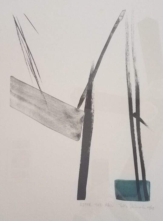 Intersecting black lines with two parallel lines descending into a blue box at the bottom right of the piece.