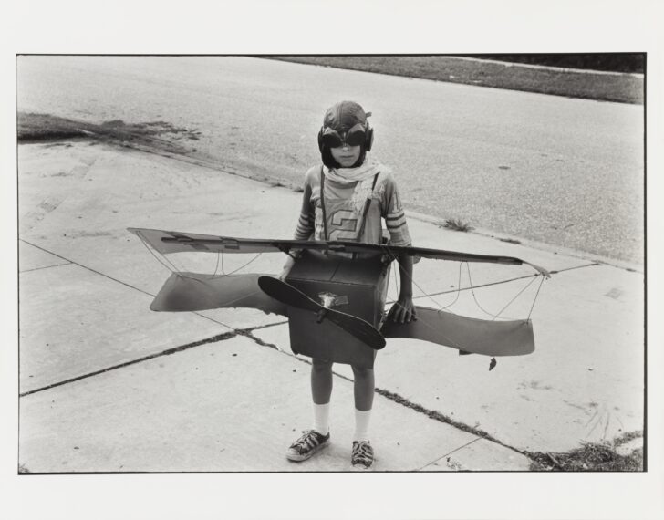 A black and white image of a boy wearing a scarf, aviation cap, and a cardboard boxed fashioned into an airplane.