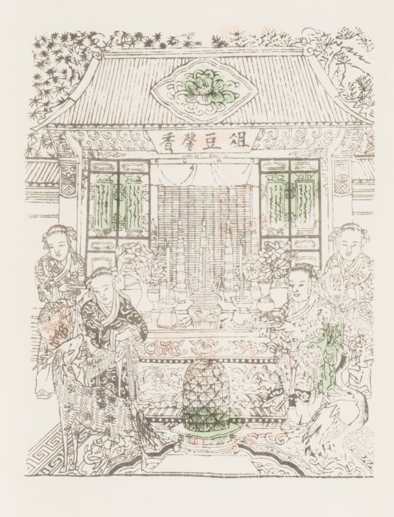 Image of four figures standing on each side of an altar with a stag and a heron. Behind the altar is a small structure with trees in the background.