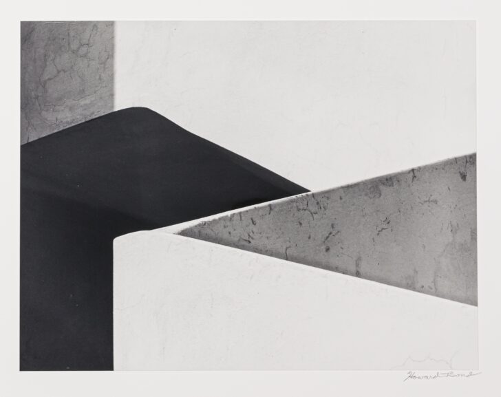 Two low walls meet in a corner bathed in sun. These walls shine white next to another corner filled with dense, black shadow.