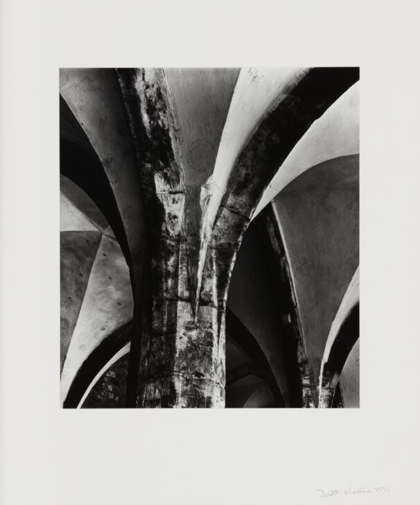 A black-and-white image of interior ceiling arches with carved, chiseled surfaces.