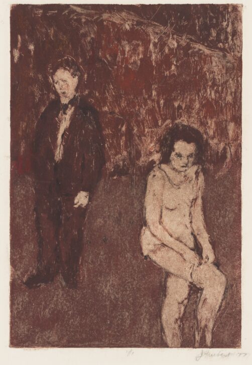 Red monotone of a man and woman with the woman seated in front of a standing man.