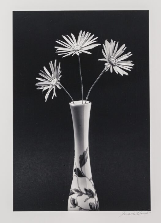 Three flowers with long, thin petals stand in a ceramic vase with glazed leaf pattern.