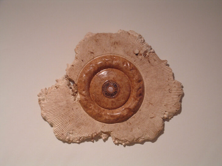 While initially he separated his two vocations so that his reputation as a famous musician would not influence how people saw his wood art, Elliott has now become a well-known wood artist in his own right for his series of vessels and wall sculptures, of which B2125 Wall Sculpture is an example. The idea for these pieces grew out of functional platters that could be hung on a wall when not in use. They radiate out from a central inclusion of a semi-precious stone, metal, or exotic wood, towards the natural, irregular edge of the burl. Elliott is highly conscious of the contrast between the ephemeral nature of music and the longevity of his wood art: “Playing music on stage is instantaneous. Any movement you make is done and gone. It’s just a feeling at that time. But with wood, the vessel I turn will probably outlive me.”