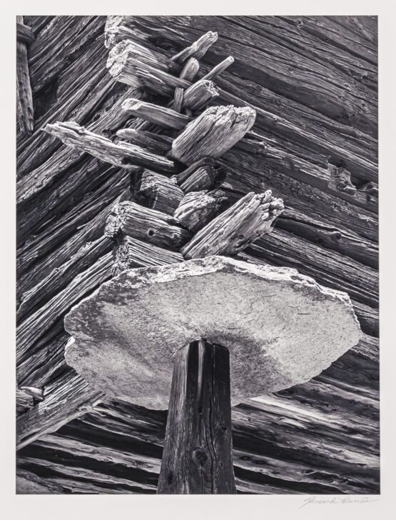 The corner of a wooden structure rests on a thin, round stone, itself resting on a stake made of the same wood as the structure. The wood has a flaked texture with thin, even layers.