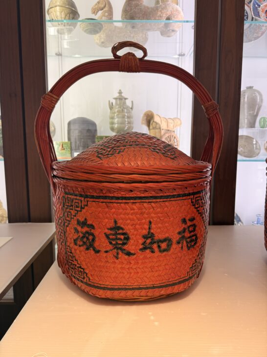 A red, woven basket with designs painted in black, a handle with braided decorations, and a shallow insert.