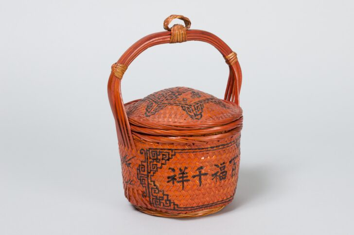 red lacquer on a woven bamboo basket