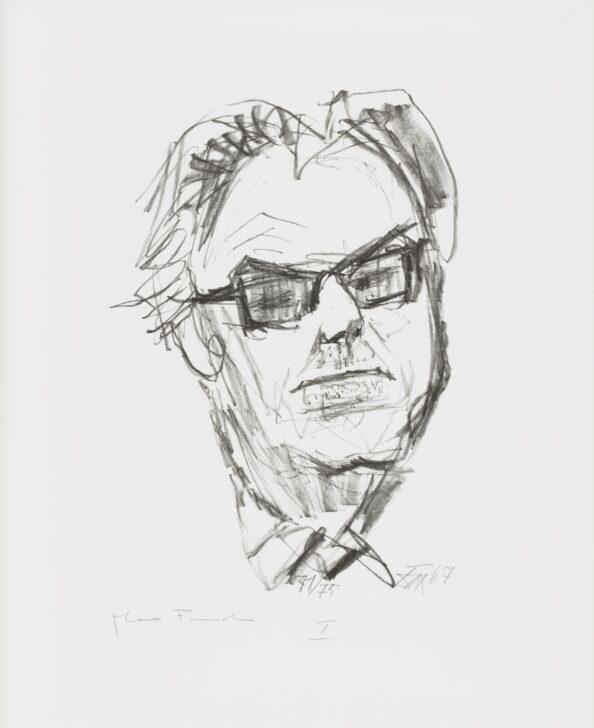 A black and white sketching of a man's face and collar. He looks upward and to the viewer's right, and wears angular, dark glasses. His hair is dishevelled and his face is unshaven.