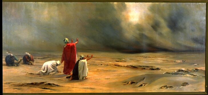 Three men praying towards an orange and grey storm, two camels on left hand side. One man is standing, others are kneeling.