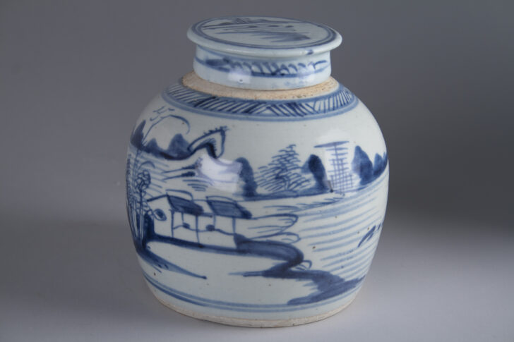 Blue-and-white covered jar with landscape design