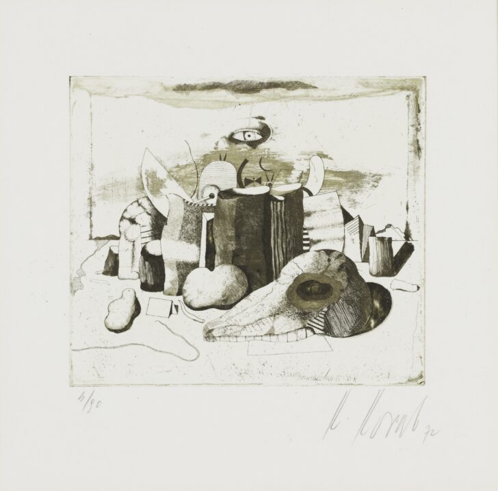 A black and white image of a series of objects, including an animal skull, positioned in a mass in the center. In the background, an eye hovers.