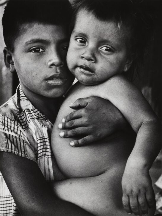 Image of a young boy holding a baby. The boy wears a shirt with a pattern of crossing llines. Both look directly at the camera.