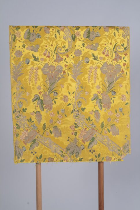 Bizarre pattern, rich gold-colored satin ground with damask-type foliate self-pattern. Brocaded pattern repeated twice per width; consitsts of narrow unfurled scroll of silver metallic thread, capped by silver feathery leaf. Stylized tendrils of silver and flowers entwine abouto scroll-like forms; flowers of pink and blue silk thread and leaves and stems are of green silk thread. Between scroll-like pattern are larger-scale conrucopia or trumpet-like forms out of wich sprout bell-shaped flowers; predominant thread is silver, with use of pink, blue and green silk threads. Complete repeat is 23", of to units of 11 1/2" each.
