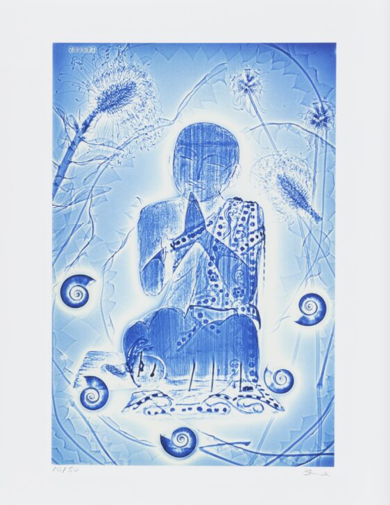 A color photograph with hues of blue and white featuring a seated figure in the center that has its hands together in front of its chest. The figure wears a patterned garment draped over its right shoulder. The figure is surrounded by shell-shaped objects and various plant forms.