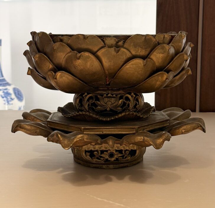 Gold-painted flower with upward-facing petals serving as the base in a three-part sculpture.