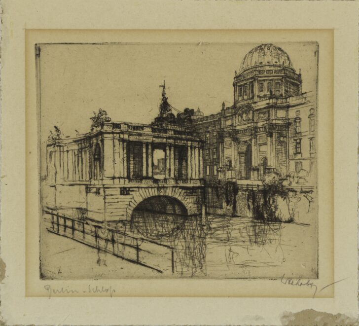Drawing of a waterfront building with a domed top and a structure extending onto the water.