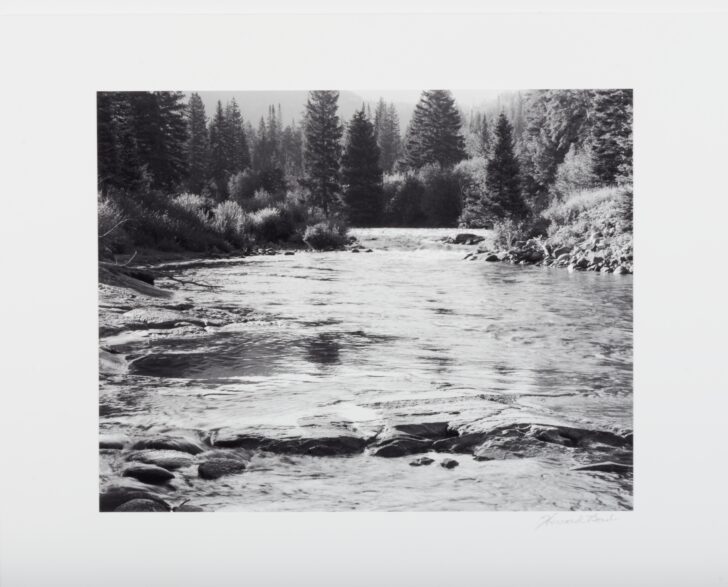 Evergreens and shrubbery line the background of this image, while a flat, sunlit river fills most of the frame.