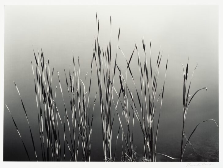 A line of thin cat tails stand against a field of gray, gradating vertically from dark to light.
