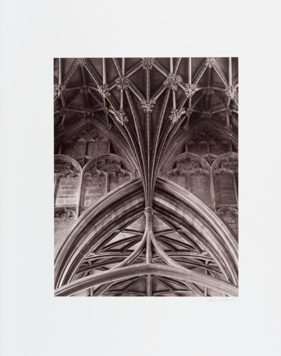 At top frame, a rib-vaulted ceiling is covered in elaborately carved botanical elements. The central ribs meet at the top point of an arched doorway, continuing into a simpler rib design that crosses the archway.