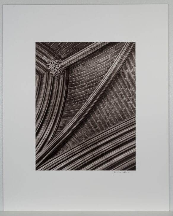 Stone rib elements of a simple, stacked ridge design cross the staggered stone rib-vaulted ceiling. A rounded element at the end of the topmost rib shows curling stems forming a cluster.