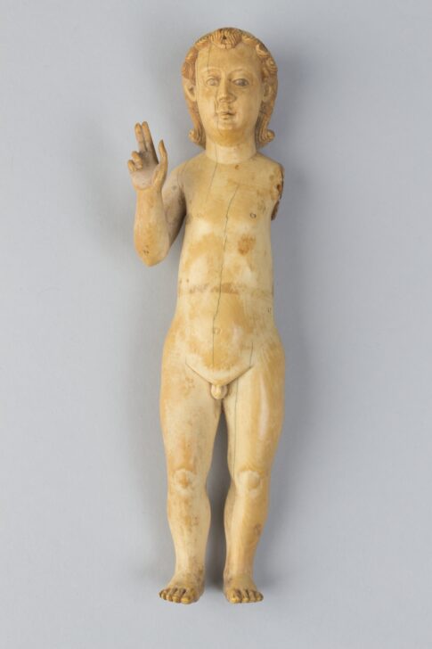 A nude, standing child figure with the right hand raised to chin-level. The forefinger and middle finger are raised and the thumb is out.