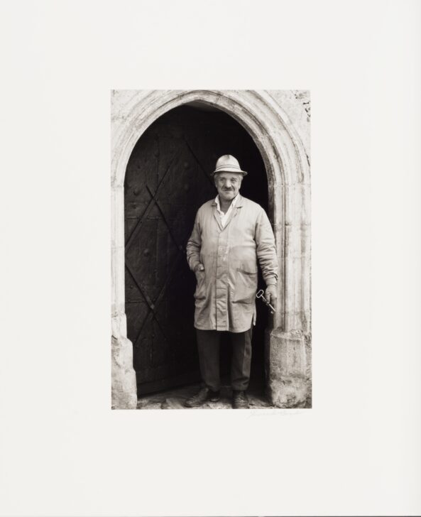 A man in a short-brimmed straw hat and long work coat stands in an arched doorway in front of a dark metal door. His right hand rests in his front pocket, and his left hand holds a large key.