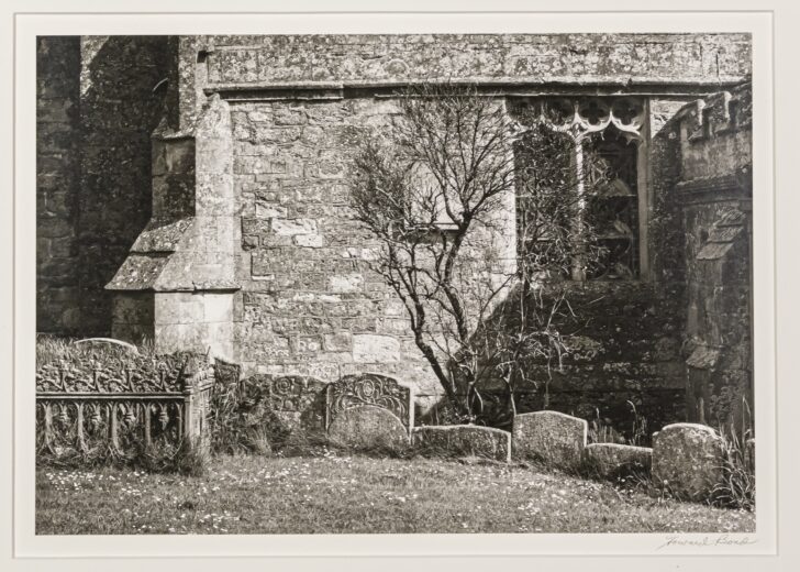 Old, carved tombstones, inscriptions erased by time, stand in the sunlit yard of a church. Two stained glass windows with quatrefoil arch details are set in a hand-set stone wall with the rounded, layered pattern of lichen.