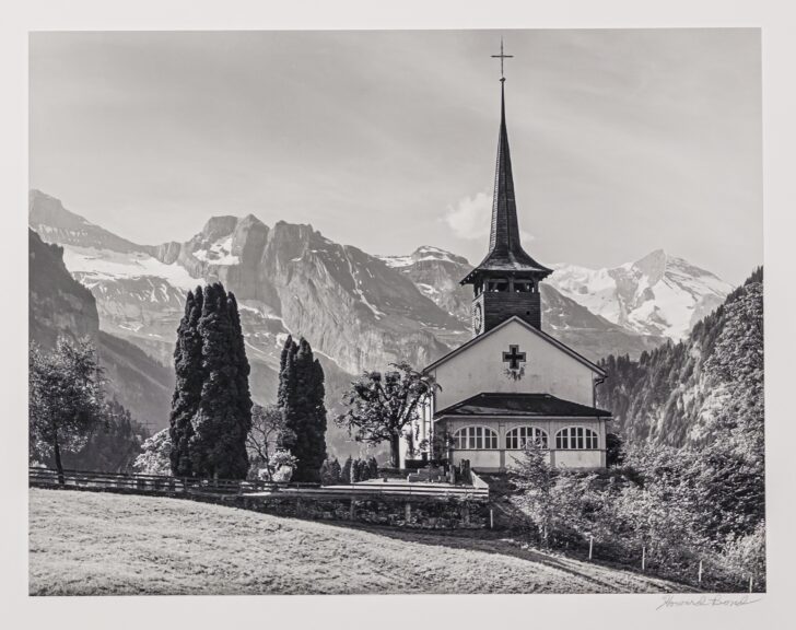 Dark evergreen trees stand next to a steepled structure. A mountain range with small areas covered in snow fills the background.