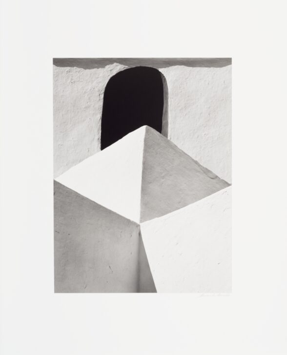 Man-made stuccoed elements are staggered against one another: two walls forming a corner in the foreground, two higher walls forming another at midground, and an arched opening in deep shadow in the background.