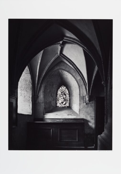 A simple rib vault is lit from an unseen window at left. At center, a stained glass window shows four figures contained in a circle, while two more figures look down from above.