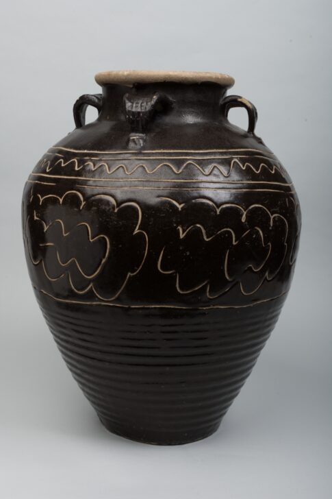 Large brown jar with small handles at the lip. The carved pattern reveals a lighter under-color.