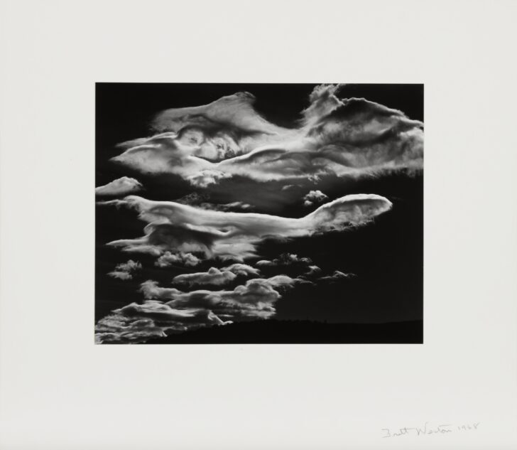 A black-and-white image of elongated stratocumulus clouds against a dark sky, hovering above a darker landscape.