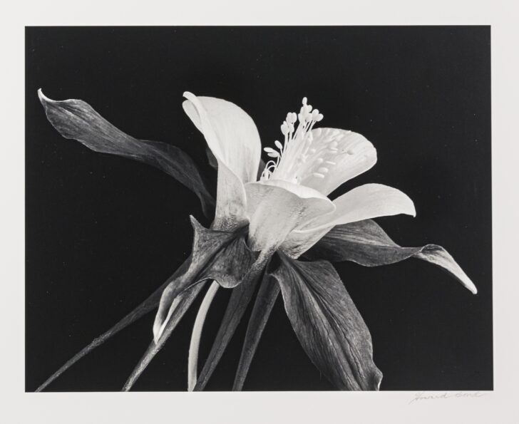 Close view of a flower with light-colored petals and long, dark spurs against a black background.