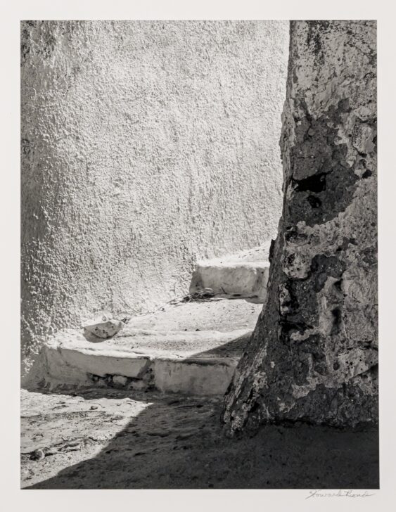 Light fills a rough stuccoed passage with two wide, shallow steps. A dilapidated wall on the other side remains in shadow.