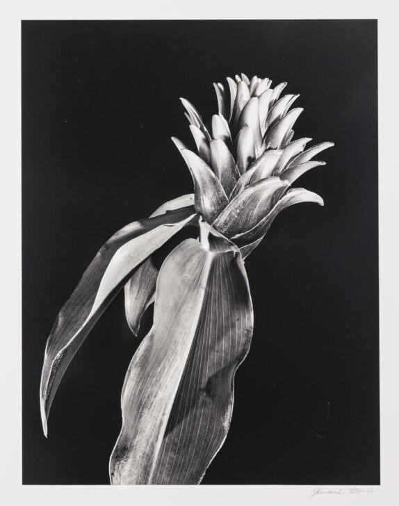 A flower made of short, thick, pointed petals grows from three long, broadly-striped leaves that hang down.