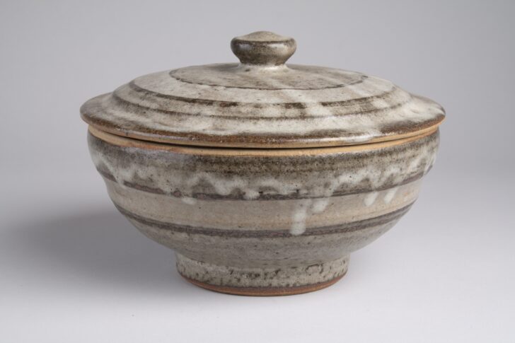 Ceramic bowl with a lid on top. Matte grey with concentric rings of different tonalities, varrying shades of brown and grey. White glaze drip around lid.