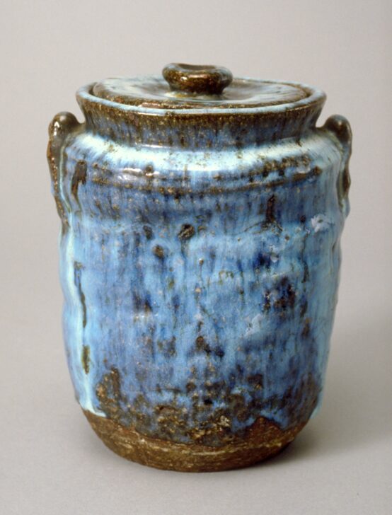 The earthy ground of this Shigaraki ware jar serves as the ideal background for a bright blue glaze. Producing wares like this entailed a high degree of spontaneity, as the firing process caused a chemical reaction that transformed the initially clear olive-grey-tinted glaze into a range of different colors depending on how they reacted with the high temperatures of the kiln. While a skilled potter could predict that the glaze applied to the jar prior to the firing process would produce a glossy blue texture, predicting the range of tonalities seen here—which vary from neon to milky blue—proved more of a challenge. Those who could control this process garnered the largest following.