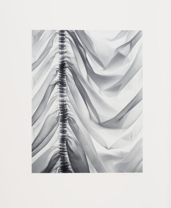 A diaphonous curtain is lit from behind, shadows forming in the softly curving folds created by a strip on the left that gathers the cloth in uniform pleats.