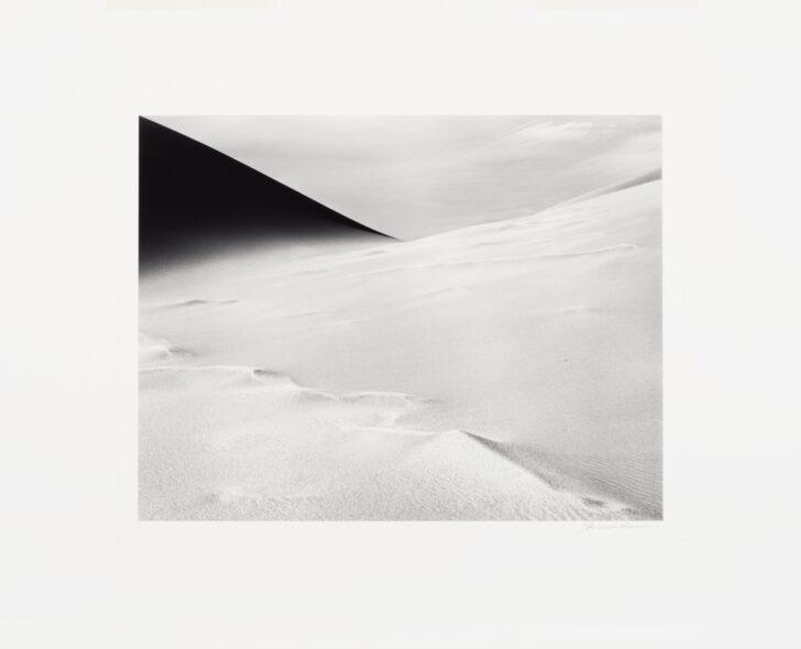 An illuminated field of sand fills the frame. At top left, a large dune forms a black triangle against a sky clouded with sand.