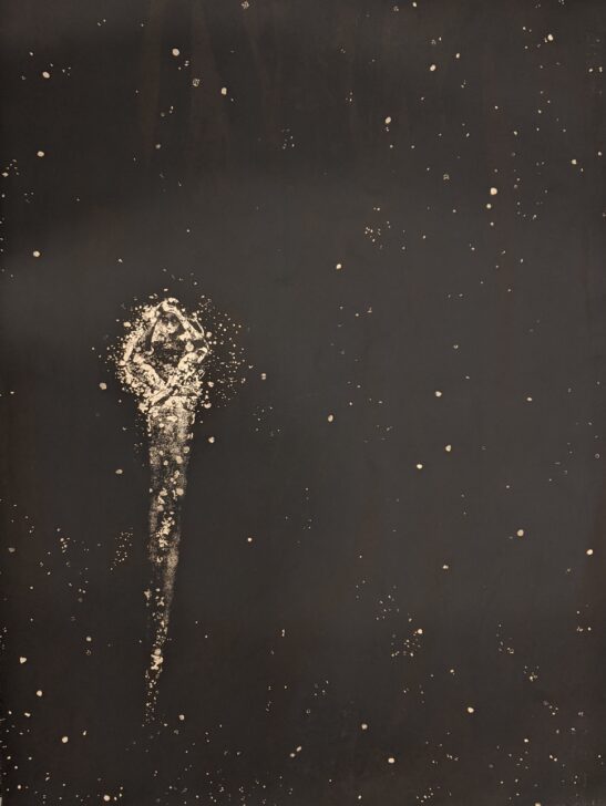 A black background dotted with yellowish spots that resembles a night sky. Just left of center is a light shape like a comet streaking from the bottom towards the top of the image. The comet shape is also a yellowish hue and resembles a figure with its arms crossed in front of it.