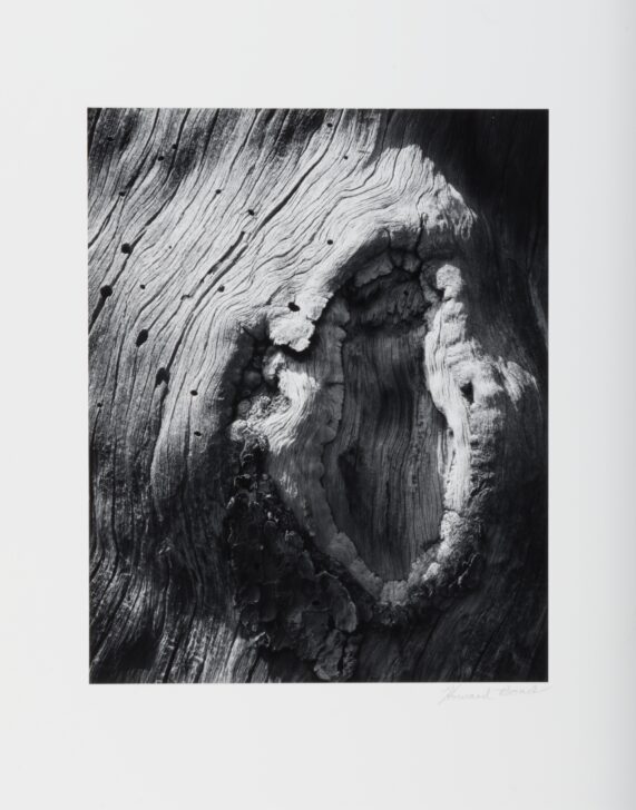 The scar formed where a branch once was is circled by lichen on an otherwise smoothly lined tree trunk with a handful of small black holes.