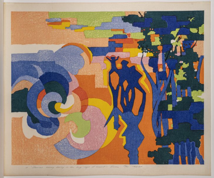 An image consisting of brightly-colored shapes, figurative and abstract. On the lefthand side are circular and crescent shapes, primarily in blue with some pink, green, and orange. On the right of the image are figurative shapes in blue and green that give the impression of figures and trees.