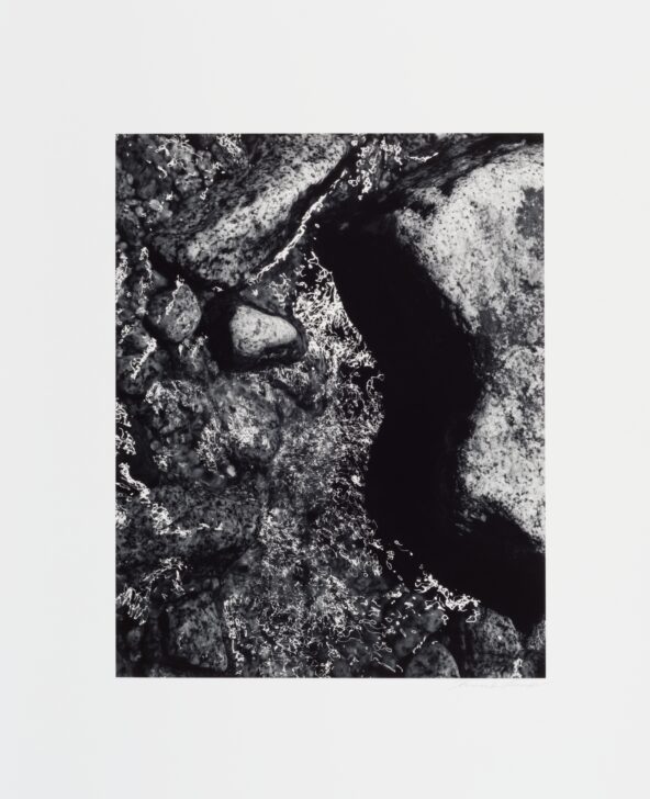 A close view of rocks lying in darker water. A jagged filigree of light is reflected in the left half of the liquid, while a long, vertical stripe of black and a large rock take up the right.